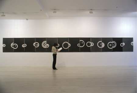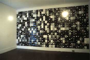It is in this sense - 'both, of course' - that the range of Hipkins' practice becomes fully intelligible. In understanding that range, a number of his works of the past decade can be seen to be crucial. The first of these is The Field, a piece consisting of 1,500 photograms that was first exhibited at Auckland's Teststrip artist-run space, and later at the Dunedin Public Art Gallery. Each image is the unique result of exposing photographic paper - on which was placed a single polystyrene ball - to light, and the prints are pinned directly to the wall in a grid formation. As Rosalind Krauss has noted of this archetypal modernist form, 'the grid declares the space of modernist art to be at once autonomous and autotelic'.(7) The grid, that is to say, is a model of modernist vision. The black and white circles, dots, haloes of The Field dance and shimmer before our eyes, forming an analogue version of a digital starry night. This stellar expanse might suggest the sublime, but it's an ambiguous version of it. While at a distance The Field dissolves into cosmic imagery-'My God, it's full of stars' (8) - up close, its ocular effect becomes entirely different. The circles seem to become eyes: the sublime looks back. Other photograms, including The Movement (1997-98) and The Port are essentially compartmentalised versions of The Field. They further challenge modernist opticality, meeting its claims of autonomy with a flickering pulse and a hypnotic visual beat. Such an optical effect, says Yve-Alain Bois, 'punctuates the disembodied self-closure of pure visuality and incites an interruption of the carnal'.(9)