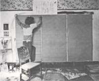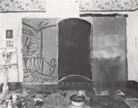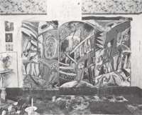 The staircase is a subject I've used more than once. Recently I did another staircase painting which was a sort of prelude to a triptych - the right-hand panel - but it didn't get beyond that. Apart from the fact that there was a staircase in the house I was living in, in Newtown, what interested me about the subject were the spatial elements, the strong feeling of the interior you get from it, the different levels and so on. It was a useful pretext for doing a painting. This particular staircase had a single lightbulb... there was a mirror. . . there were paintings on the wall . . .