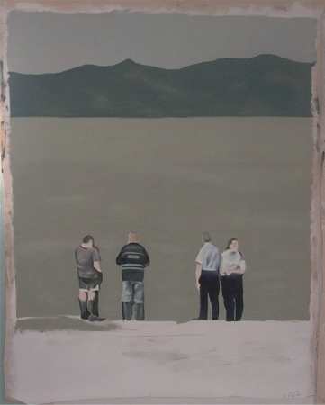 I am drawn back to painting, then, as a field in which new art experiences may be on offer. D.B.C. (Dave) Goodwin has painted some big open landscapes, with broad bands of land, water and sky, and a few figures on the shoreline. He painted them last year, but they were not included in his recent exhibition at Ferner Galleries. They record the aftermath of a small plane crashing into the Firth of Thames, killing the two men on board, but this event is captured, more than recorded, in the sombre mood of the paintings and the demeanour of the figures. Representational forms here function equally as abstract elements, and are easily grasped in terms of both space and flatness. The remarkable tonal control, the shifts and gradations of grey, bring to mind Whistler's riverscapes.