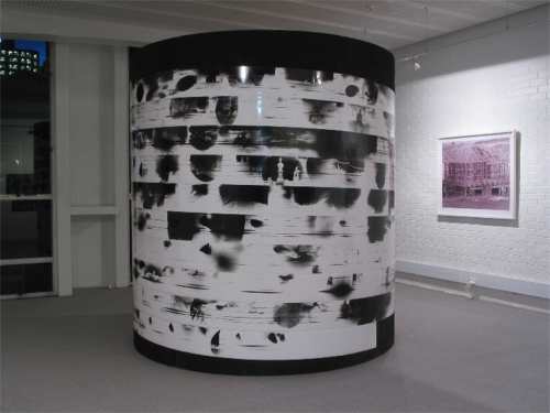 Really, the experience of looking at Glass' work was notable, not the images themselves. There was no logical point at which to start looking. One could walk and 'read' around the cylinder, or up and down the stacked negatives, and one's looking was interrupted either by the gaps between images on a horizontal band, or by the upper and lower edges of the negatives when read vertically. It was necessary to get up close to decipher the images, but ultimately they were all contained by the single cylindrical object with its own physical presence. The experience of looking at the work was jumpy and exciting, and long.