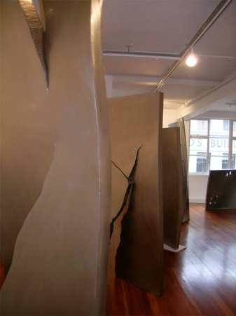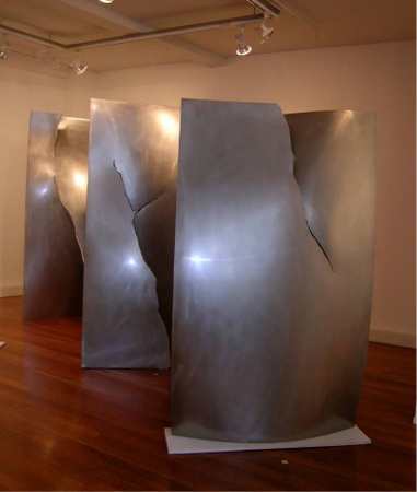 At the McPherson Gallery, David McCracken's seven steel sculptures also featured polished, or rather burnished, surfaces. However, they had the advantage of mass. The title of the show was Romantic Portraits of Raw Materials. They were big, planar hunks of steel, twisted and torn as if they were clay-remarkable feats of workmanship. In Cold Rolled Plate with Tear and Diagonal Shear in Cold Rolled Plate, the rectangular plane divides and parts towards the bottom, so that the sculptures stand on their own two 'legs'. But these works seemed less 'true' (fuzzy word, I know) than those with a more continuous curving facade, like Cold Rolled Plate with Vertical Shear - best in show, to my mind. Perforated Sheet would have been better without the perforations, which looked arbitrary, not aesthetically 'right' or 'felt' (more fuzzy words, but I think I'm right). The perforations in A Part made more sense, in tune with the upward lift of the work.