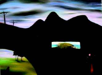 Works such as Rear Vision offer a lingering gaze rather than a glimpse, which is facilitated by the smoother style. The view through a car's rear view mirror appears as a sharply defined horizontal rectangle floating disembodied against the landscape. The passing of time is suggested through the contrast of what is seen behind and what lies ahead. Here a vivid green verge with a pathway leading to a lighthouse are being left behind as the car approaches the damp black/brown hills ahead. One feels the desire of wanting to return and lie in the sun on the grass or perhaps to explore the mysteries of the lighthouse rather than to continue on into the darkness towards home.