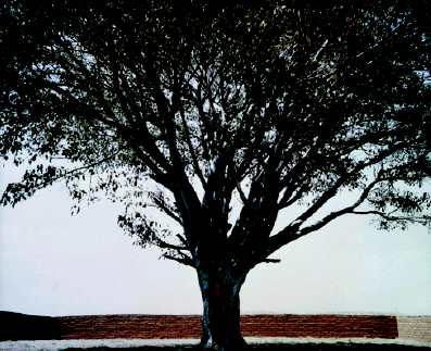 Initially the two screens are divided creating contrast between the body and the land as one screen slowly pans back from the artist's closed eye to reveal her face and in turn her body clothed in black and embedded in a tree. The tree is surrounded by a brick fence. The second screen pans across parched hill tops and gradually the viewer becomes aware of black figures emerging from the top of the screen. These figures clothed in black, sweep across the hilltops like an infestation either fleeing or desperately seeking asylum. As the pilgrimage nears the tree a circle of chanting worshippers appear and reappear becoming more frantic as the figures reach and finally climb the fence and surround the tree. The woman inside the tree vanishes or becomes one with the tree as the figures approach, the two screens then briefly meet portraying the same scene.