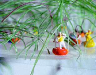 A number of saucer-shaped robotic forms on wheels have been constructed to support plant life - a synthetic natural environment where tiny plastic holiday makers take part in recreational pursuits such as gymnastics or lounge around on lilos sheltered by an exotic canopy of experimental greenery. Smaller constructs on wheels supporting plant life have been specifically constructed for mobility. One can't help but feel that this particular colonisation of an otherworldly Eden is overshadowed by the notion of inevitable exploitation.