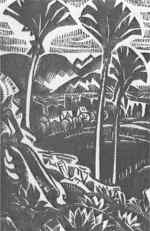The colour linos and block prints of George Woods show a much greater degree of liberation of the colour phases. In his colour prints, George Woods sustained a planar image: but he was a powerful draughtsman, with a strong plastic sense amounting to the sculptural. (For an example lying outside the scope of this exhibition .see the acquatint Mamu: Arts Year Book 1946, page 77.)