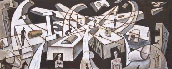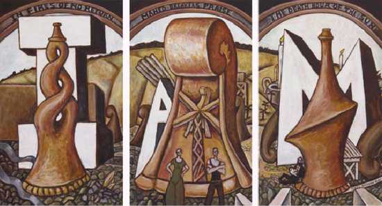 Tower for Oceans is literally based on the I AM whose solid letterings provide the foundations of the structure. Again, it is a painted image of what could be a Constructivist sculpture, but built into it is the recurring, highly stylised form of a wave. These waves are motifs throughout Will to Meaning. They are petrified, caught in the instant before breaking. Quite abstract, they encode messages about our fateful relationship with the sea. The tower is for oceans, yet we know its construction is part of a pattern of human activity that is now placing us in jeopardy. The homage is therefore deeply ambivalent. Brown’s man, woman and dog archetypes are about its base, but we have no clue as to their connection with it. All we can see is that it has outgrown them, reducing them, its possible makers, to virtual inexistence.