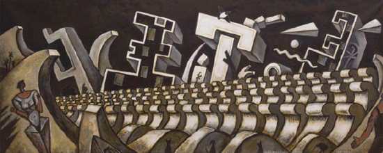 That edge could well be a coastline. One of the largest paintings of Will to Meaning certainly suggests this. In Sea Rising the entire breadth of the work is taken up by ranked waves of an apocalyptic sea. They are an almost mechanical series, suggestive even of a giant computer keyboard. Highly formalised, they move inexorably towards the viewer. The painter sees them as musical forms, not necessarily nihilistic, through which we must pass in weathering the crises of climate change. Behind them are the reeling towers of a collapsing urban architecture. All that punch-drunk glory, all the grandiloquent blindness of developers thrusting their buildings skyward become in this painting the subject of a judgement: Property men are busy counting floors of cement sepulchres where they migh shelter when the two oceans rise and eat with green salt jaws the foundation of their lives.(2)