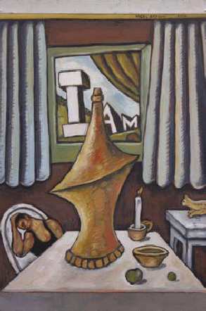 Then Brown offsets it. He offers what he describes as a ‘gentle apocalypse’ in the Breakers Praise Triptych. This is a massive, yet contemplative painting built around the I AM and the eloquent forms of giant ceramic sculptures, all under the aegis of words by Baxter: In fires of no return Maned breakers praise The death hour of the sun(3)
