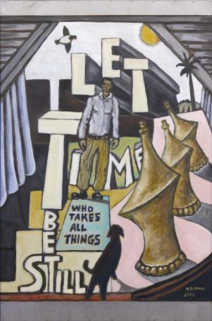 The artist is a kind of historian, one who knows history is both time past and prophecy. His paintings combine elements of our past in constantly changing assemblages. These deploy not chronological, but dramatic time—time as it is in theatre or poetry. Aristotle noted that to write drama well was to create an ‘action’—a plot that had a sense of necessity to it. Brown’s paintings are actions in this sense. They are orderings of events and figurative elements so as to bring out their most significant connections or meanings. This is a dramatic principle, and the paintings may be seen as dramatic ‘actions’. Such ‘actions’ interpret the past and construct the predicaments that face us now. They are not acts in the everyday sense of the word, but are the structure of meaning itself.
