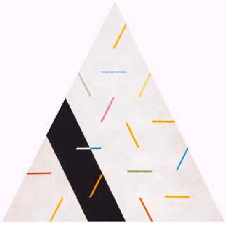 Triangle Suite No. 5-Drop reveals a different approach. The painted triangles, together with the triangle of the support, counterpoint the coloured parallelograms, themselves instinctively halved by the eye to become additional isosceles forms. In both works the shape of the canvas has a kind of inevitability—the composition would by no means be as successful if constructed within any other frame.