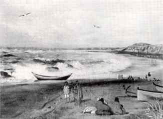 Beach at Taranaki, with Maoris and boats