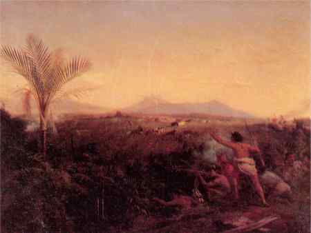 View of Mount Egmont, Taranaki, N.Z., taken from New Plymouth, with Maoris driving off settlers' cattle was completed in 1861 and written up by the Melbourne Argus as follows: Mr. Strutt, to whose merits as an artist this journal has frequently borne lestimony, has just completed a picture of more than usual interest. It represents a raid of New Zealanders upon the flocks and herds of some settlers; and as every figure in this composition was a study from the life, and all the adjuncts of the scene are likewise faithfully copied from nature. it invites, and will repay, a careful examination. In the middle distance several Maories [sic] are seen urging the cattle they have lifted at full speed up a grassy slope, while one ot the natives has just dropped from the bullet of the pursuers, who are only indicated by the smoke of their rifles to the left. In the foreground an ambush of natives, half hidden by the beautiful vegetation of the country (among which the kopakopa and the superb Nikau are conspicuous), are marking down the pursuing settlers with deadly precision. This group of figures is painted with masterly skill and high finish, and a like attention has been paid to the more distant objects, Mount Egmont, and the neighbouring range of hills, and to the aspect assumed by the clouds which gather round that snowy peak towards sunset. (9)