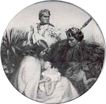 In 1863 a group of Maori chiefs and their wives visited England; and in November the baby son of Hare Pomare and his wife Hariata was christened in the district church at Tottenham, in the presence of a representative of Queen Victoria, who stood as godmother to the infant. Shortly after, Hare Pomare and Hariata were received by the Queen at Windsor Castle. It must have been on this occasion that Bambridge, the Queen's private photographer, and John Mayall, another well-known Victorian photographer, took carte-de-visite photographs of the Maori couple with their baby.(10)