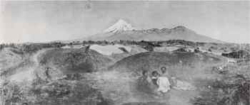 The first, a fairly uninspiring oil entitled Taranaki (showing Mt. Egmont from the country in the vicinity of New Plymouth) (Alexander Turnbull Library) is dated 1856 and must have been painted about the time of Strutt's return to Melbourne. At the time of his arrival in Taranaki, Strutt, like other artists, had been struck by his first sight of Mount Egmont, which as we approached was most impressive: its beautiful outline and the grandeur of its form standing alone and towering up to the height of 9000 feet, its summit crowned with perpetual snow, glittering in the clear atmosphere of this region, cannot be described or painted; it must be seen to realize its wonderful beauty. (5)