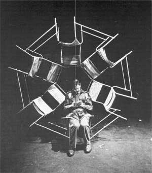 When it came to discussing the chair-sculpture his explanation of its purpose appeared far less convincing. To Booth the chairs symbolised several things. . . the engine wheels that carried the troupe off on their tour, a military medal, movement up-country, and so on. None of these allusions had occurred to me when watching the play and I couldn't help feeling that the sculptor in so insisting had overshadowed the necessary clarity of the stage designer. Having said all that however one must now state that the over-all design for Privates was visually stimulating and eminently workable in a manner hitherto unseen at the Mercury for a considerable time.