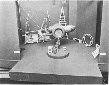 The one major transitional problem for Booth is one of adaptability. As a sculptor he has been used to working alone (usually in some remote rural area). Suddenly he has found himself amongst a highly volatile group of individuals, all laying down certain requirements that must be met within a specified time. He works, as do most stage designers, in three stages. First, he reads through the script three or four times to get the feel of the play, and marks down scene changes, prop and costume requirements. Consultation with the director then leads him on to the second stage - the making of a model. Once the model is seen to work he transfers his attention to the final set, supervising at each interval the construction and painting of materials.