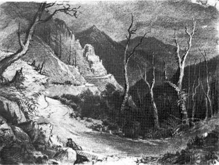 As he grew acquainted with both the landscape and lighting Chevalier was able to seize upon the essential features more easily. His drawings, it must be stressed, were working drawings and not works in their own right. In 1866 a critic writing in The Australasian said: 'The chief fault that we have heard objected to both [Chevalier and Von Guerard] in different degrees, is that of stiffness, of not being easy and flowing enough in their outline and contour'. This is, perhaps; a criticism one would still accept today. But in Chevalier's defence one can say that his drawings of the landscape are economic, perhaps the result of his preparing drawings for wood-engravings when he worked for the Melbourne Punch.(4)