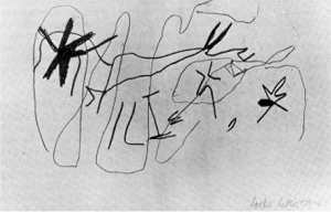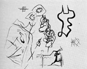 6. Compare his earlier comments on copying and 'making this very accurate drawing'. Existing examples of his drawing suggest his 'doodling' does not pre-date his arrival in London. It is worth noting that between 1925 and 1927 Miro and Masson began to paint 'doodles' and that 'automatic drawing' was described by Breton as a leading characteristic of Surrealism in his first 'Manifesto' of 1924. The influence of cave drawing is quite clear in Lye's paintings of the mid-30s.