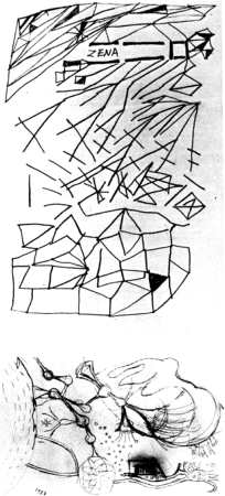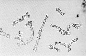 L.L.: No. Yeah, I've got a sketchbook of lots of these. On the one side of my black sketchbook - the school exercise book - plain pages. One side I wrote out everything about Freud's Totem and Taboo. I was reading it. I wrote this out so that writing it would force me to remember what the guy was writing. Well, it didn't work. But, anyway, I wrote it all out. Then, on the other side, to keep it down to my own territory, I would do these drawings - African, or Maori, or whatever primitive brain art I had. So I was gradually filling up this book. I would never write 2 or 3 pages unless I had 2 or 3 pages of drawings on the other side, see? So, I've got one of these books. This is the kind of practice that goes on. Now, with that sort of practice going on, you've got no time to go ahead if you've got no studio, and no means of doing anything for manipulating gadgets, see? But you're keeping your brain sharp. Now I would go to a movie. See this fabulous Papuan film. Captain Frank Hurley. An Australian documentary. Long before Grierson and people. He did this Pearls and Savages film.(8) I go there and come out absolutely enthralled. Because here are the guys that I'd really paid homage to, you know: dancing, and strutting around with feathers and God knows what and so on. So, I would get this bright idea: film! That's how to control motion!