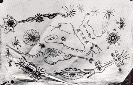 L.L.: That's right. Without even seeing them, because electronic microscopes weren't around then I don't think. Whether or not they were around doesn't matter because I hadn't seen them. As a matter of fact I only work with the feeling of something magical, something seemingly significant. And to keep it magical I don't want to know the story involved, I just want the hypnotic effect of it somehow seeming significant without knowing why.