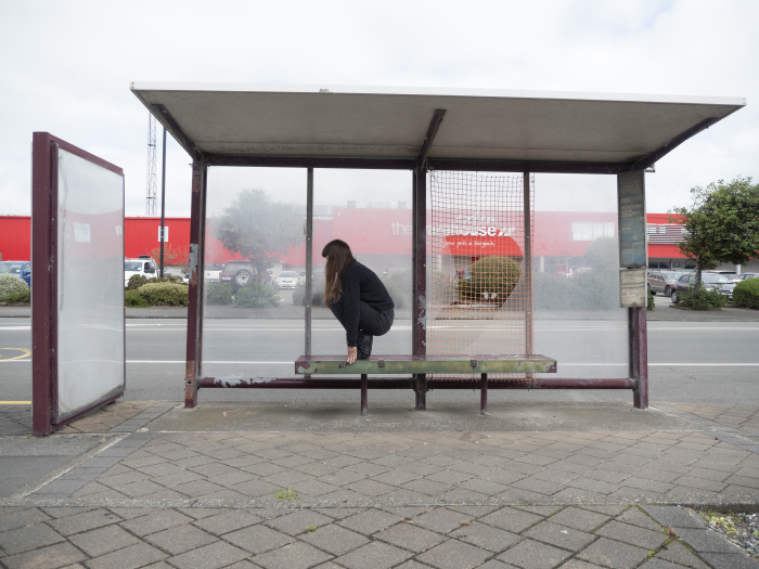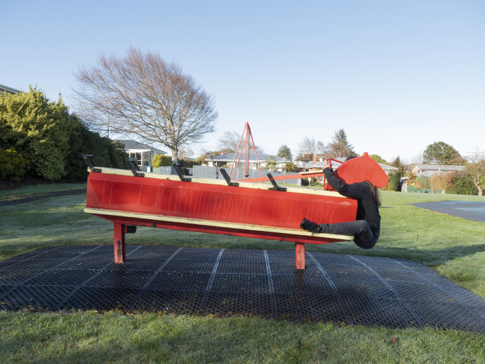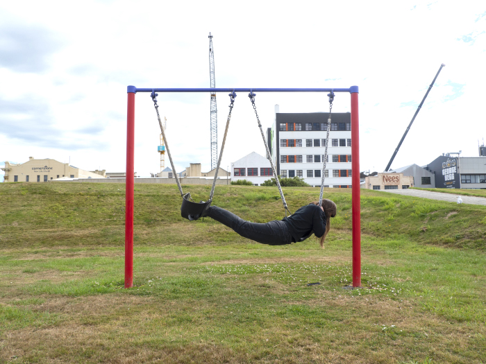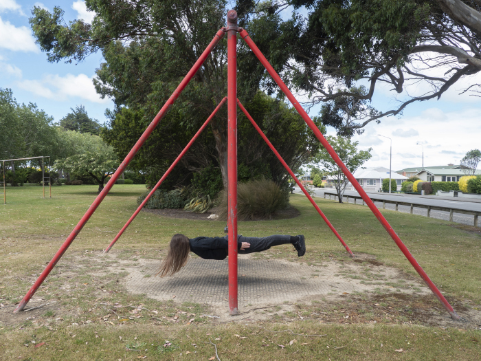 The series can be divided into collections, each exploring space. The ‘domestic’ collection features Fletcher draping herself over kitchen cupboards, a commentary on the often overlooked physicality of domestic work. The ‘playgrounds’ collection, on the other hand, is a study in monotony and repetition, with Fletcher positioning her body in empty Invercargill playgrounds that all look eerily similar.