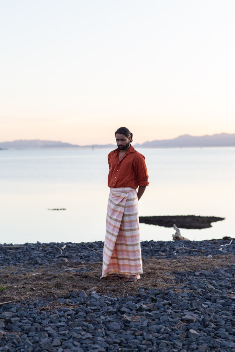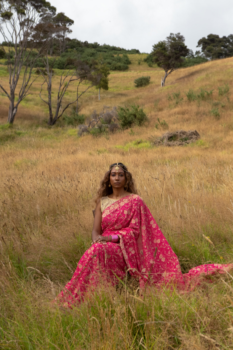 Yet, the subtle differences are also striking. The subjects are firmly of here, embedded within a post-colonial landscape. They sit within the meadows, shorn hills and introduced trees of Aotearoa; they take shelter and struggle, like everybody else on this land. They are also dressed in outfits that demonstrate their histories and pasts— the colours and the patterns create a clear sense of agency. In Radhika, the subject is wearing their mother-in-law’s striking sari in among the long grass. In Marigold Head, the subject becomes less personalised through symbolism, drawing strong links to the subject’s ancestors. This is perhaps Chinniah’s most political point—that despite the fraught currents of immigration, war and British colonialism, in twenty-first-century New Zealand, Asian and African subjects also exist in these landscapes, and have done so for generations.