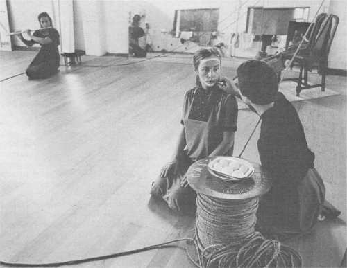 In one of the base angles, a dancer was masked. The suggestion was of a role adopted a withdrawal to the first degree of false consciousness. In the other corner, the dance playing flute was blindfolded, the flute taken, the woman roped. From the third position under the apex of the triangle, the cello drone began: harsh and unremitting.