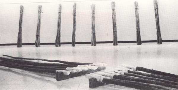 Form and materials are affected by environment. The sculptures he made in Fishing for Life/Balancing (Centre Gallery Christchurch, 1975) reflected the geography of Canterbury. They were largely horizontal structures, but with some vertical projections. The materials were river stones, string lines, sticks, paper, rag and epoxy resin. When he moved to Auckland, he continued using similar materials but felt he was 'failing back on old solutions'. Tensions within his work reflected his own tensions about having to earn a living, and about coming to terms with the often lonely and difficult process of producing creative work outside the comfortable umbrella of art school.