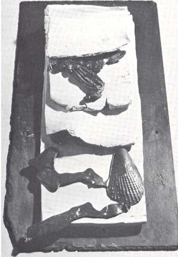 Hellyar's Rock Nooks consist of boxes with slates (held by flat-headed, galvanised nails) and interior layers of hollowed wood containing bush slugs, seaweed, limpets, snails, and similar objects. Related techniques are used in her other exhibits - many consisting of ceramic containers (white, unglazed) which enclose appropriately shaped pieces of pumice surmounted by ferns cast in bronze, or crabs and snails moulded in lead. In her more 'minimal' pieces, the natural surroundings of the objects she uses as points of focus have been reduced to little more than ceramic slabs or pockets composed of these. One of her most interesting pieces (not included in this exhibition, but related to it) is the curiously conceived form of a fish resting on a wheeled trolley - possibly one of the most effective wordless statements so far made in this country on the subject of conservation.