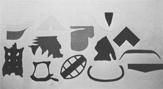 Richard Killeen continued his investigations into the possibilities of the 'cut-out' with five 'arrangements' - four of pieces of painted aluminium, one of unpainted copper - of ten to thirty pieces each, tacked on to the gallery walls. The works were produced from December 1980 to October 1981, and reveal some marked changes - in the handling of the materials; in Killeen's approach to the formulation of the cut-out; and to the matter of the 'meanings' cultural products can have.