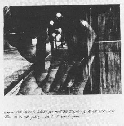 In 1980 Alexis Hunter stopped exhibiting exclusively in public galleries - where she reached a wide, theoretically educable audience - and began showing some less overtly political pieces with a London dealer. She had wanted to return to using paint and began experimenting with this on top of some discarded photographic sequences. This work she describes as more decorative and ambiguous, emerging from the heart as much as the intellect. She is always aware of her audience: and, in her view, the audience in dealer galleries is more sophisticated, more able to read through layers of paint to the political content of works if they wish to. In doing this, she runs the risk of having her work categorised as radical chic. Certainly in her Auckland exhibition many viewers were disconcerted to see works which were not overtly political in content. Yet she included two pieces which she would normally show only in a public gallery (because they are strongly feminist) and these works attracted considerable attention.