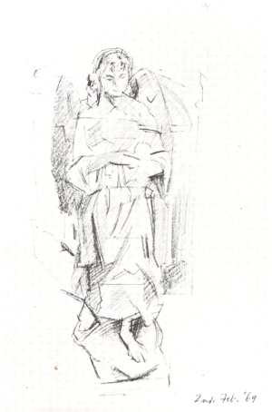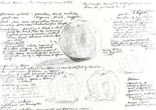 One of the ways in which she most differed from her contemporaries was that she had no concern for art fashion. She knew what was going on in painting overseas but, at no time, trimmed her sails to the winds of Art International. Though no servitor of fashion she was, in fact, quicker to pick up contemporary ideas that were useful to her; colour theories, cubist flattening of form in drawing, simultaneous views of the same object (splayed out two ends of a shed) or composite views of the same landscape. Her technical range was wider and more susceptible to change than that shown by either Evelyn Page or W.A. Sutton: although she described her own work as coming 'somewhere between' these two. Nor did she become 'abstractionist' or 'realist' or 'surrealist': but something from these modes can be found in her work. The notes she made of exhibitions seen and works studied in her early year overseas (1958-59) show that she was well aware of contemporary art movements. Her difference lay in her ability to absorb or reject the contemporary, and also to return to the traditional by careful study, even in the final decade of her life, of such a treatise as Eastlake's Methods and Materials of the Old Masters.