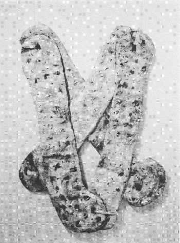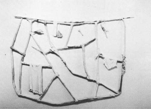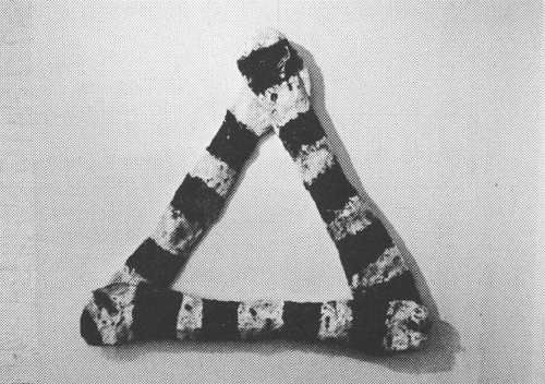 Pimpalgaon, for example, hangs as a light, very open, very flexible, and fragile grid, its thin bony limbs (gessoed, twisted rolls of newspaper) interlocking in a loose, irregular network. In its iconography, it contains these signs/obsessions from earlier works: the all-important bones, both real and simulated, bound and bandaged; items of clothing, both actual (stiffened, white child's singlet) and suggested (flourish of crisp Zurbaran drapery); a small, baffling, symmetrical object (of asbestos): spiky, arrow-like clusters of painted sticks. In addition, there are three four-inch galvanized nails, sharp ends jutting out. These objects are reminders of the organic nature of life in the small Indian village that Olsen visited, and from which the work takes its name. They also have associations with poverty, pain and death. (Interestingly, Pimpalgaon was underway, Olsen says, while she was involved in working with crippled children.)