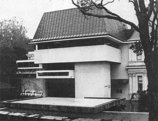 The Auckland City Art Gallery buildings were designed in 1884 by the Melbourne architects Grainger d'Ebro. Construction was completed and the fine building (which initially housed the City's administration as well as Library and Art Gallery) was opened in 1888. It was a splendid edifice on a commanding site, the advantages of which are readily apparent today. Close to Aotea Square, the developing heart of uptown Auckland; two small blocks from Queen Street; adjacent to Albert Park, a beautiful glade of Victorian design; over the road from the Central Library and a few steps from the University of Auckland, the siting could not be better. Although P.A. Edmiston's bequest envisaged a new Art Gallery to be built on a commanding site removed from the City Centre such as the Auckland Institute and Museum, serious consideration has never been given to relocation. At the time of the First World War the first addition to the Art Gallery complex was made, the Mackelvie Gallery; now to be a services block. At the time of the first Director's appointment, Eric Westbrook, this same wing received some architectural modification which included a mezzanine floor and sweeping staircase. Other spaces have received adjustments but the first really major renovation was that undertaken at the end of the 'sixties and opened in 1971. It included a new Gallery entrance, four large galleries rebuilt on two levels, new library, new administration and revamped service spaces. It was a major initiative and the current building programme is the second stage of that.