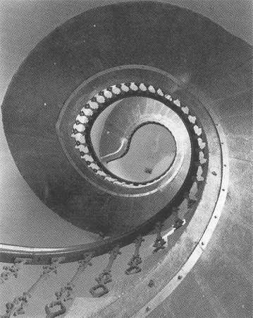 One of the great delights of Stage One is the circular egress stair in the corner tower. Slabs of granite are cantilevered out of the tower walls to form a long spiral passing through three floors. With the domed ceiling at the top, thick white masonry walls, undisguised stone steps, kauri hand-rail and cast iron balusters, this staircase is sheer magic.