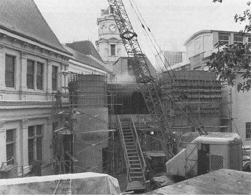The rebuilding programme involves two distinctly different projects. One is the renovation and conversion of the original buildings, the other is the erection of a new five-level block in the rear, fitted to a triangular space between the Kitchener Street wing, the Wellesley Street wing, and Albert Park. Both projects are, however, intimately inter-related. Because of the considerable costs of by building to the seismic specifications of the Ministry of Works, the Auckland City Council resolved to build to their own, less costly, code, thus forgoing the opportunity to finance that part of the operation from loan. The renovation programme, therefore, has been a charge against Council revenue and this cost has been spread over the tail end of the 1980-81 financial year, the 1981-82 and 1982-83 financial years, and will carry forward into the 1983-84 year. Completion is scheduled for October 1983. The new building is not beset with the same problems however. Seismically separated from the original buildings, it is of modern construction, meets Ministry of Works requirements and is being financed from loan. It too is scheduled for completion in October of 1983.