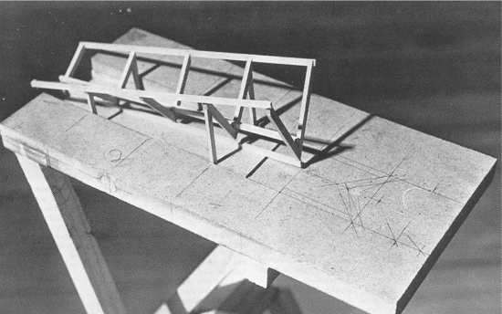 This is illustrated in Table Series Number 2, where the splaying action of the table legs plays no part in effecting the folding of the table plane. However Table Series Number 4 is a well-conceived and well-resolved work. Its table surface is rotated, allowing one corner to drop slightly over its supporting frame. This disjointed plane allows a shadow to be cast from a flat spruce construction, resulting in a subtle interplay between model, shadow and drawing.