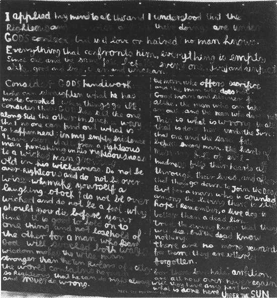 The words themselves, apocalyptic proclamations from Ecclesiastes in the New English Bible, are set within a cosmic landscape. Below is the barest indication of the earth's curved surface. Above there is infinite darkness, divided by chains of dotted lines and illuminated by the words which glow upon the surface.