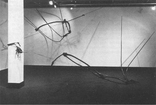 In Large Soaring Bird Ensnared the entangled wing forms were ripped apart by gleaming wires, the body pitilessly pinned down. In Study: Bird Removing Foreign Object From Its Wing the bare, suspended wing forms were sensitively bent and clawed in an almost calligraphic gesture of pain. Moving away from traditional concerns of mass and volume, Bing's sculptures were intensely lineal. His forms, extending from floor to walls and ceiling, appeared to be literally drawn in space.