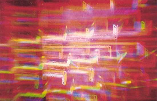 A further aspect of viewing these works was the provision of a pair of Spec-a-Dellics. The specs are polarised light sensitive spectacles with light refractive surfaces which change white light into a bright (colour) spectrum.
