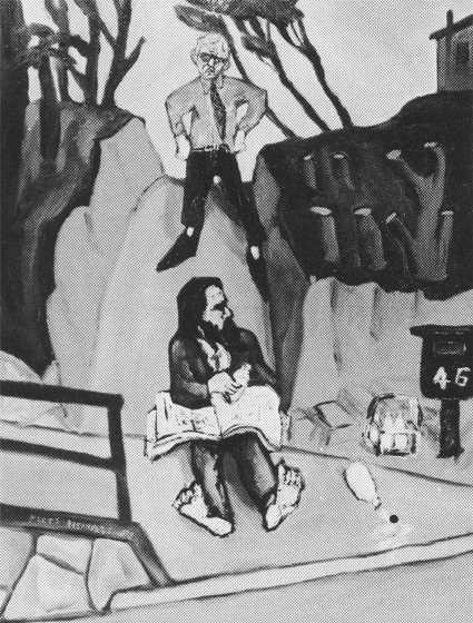 POETS: The figure of James K Baxter who appeared in the Driveways achieved true prophetic status in this series. In several large scale works, including one fine triptych, the poet becomes a massive presence - like a figure in a Diego Rivera mural. His solid form sees part of the land and he can no longer be ignored as he was by the suburbanites in the Driveway and Playground series.