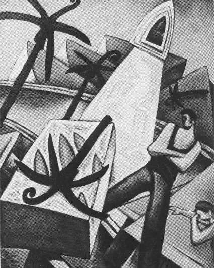 CLOTHESLINES: The artist depicted an Onehunga backyard as a boat (? another Ark), its high fences forming the hull. Masts were telephone poles on the road and the foremast was the standard square clothesline. The featureless lawn was the deck and the simple house became the boat's superstructure. The clothesline, a similar shape to Brown's stylised fern tree, stood like a totem being worshipped by the housewife bedecking it in ceremonial nappies. The boat was no doubt adrift in the suburban sea and in danger of foundering.