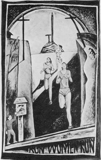 TRAMPERS: Stick-like figures with heavy packs, ferns, steep tracks and waterfalls and a return of the words forming part of the picture frame. The artist explains that the images are drawn from unpleasant memories of a hunting trip with his father when the party was bush-bound for days, but the message transmitted by the pictures was unclear. New Zealanders carry heavy weights up hills because they enjoy it, and they are free to lay down the burden whenever they like. Freedom to wander through the unspoiled parts of our land is one of our special privileges. The use of trampers as an analogy for the burden and struggle of life in general put too much strain on the images. The result was unconvincing. (Losses 1, 3 and 6.)