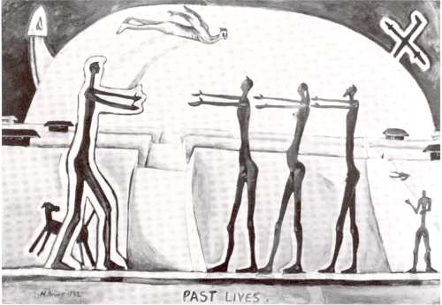 PAST LIVES: A distinct new group of works showing the mystical link between the past and the present, the spiritual and the material selves. Another successful use of schematisation to make a fresh convincing statement. Skinny male and female forms, standing on a plain which evokes the Last Time I Saw You series, project their spirits on to the astral plane.