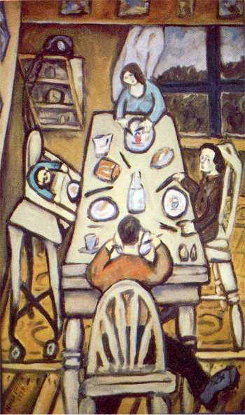 TABLES: Now the stage-like setting is the family breakfast table, titled up cubist-style with the black cross formed by a four paned window in the centre background. The family groups seated around the tables are all beset by despondency. The adults' heads are often tilted to one side in an attitude used by McCahon and derived from traditional church art. Other references to McCahon in the series are the ochre and black colouring, the brushwork in the corners of the room, the cross shape and, just to show that the artist is paying his respects to his teacher by these allusions, reproductions of McCahon paintings on the walls. The 'bowed head' is used by Brown in many later paintings, another addition to the artist's repertoire of symbols and stylistic devices.