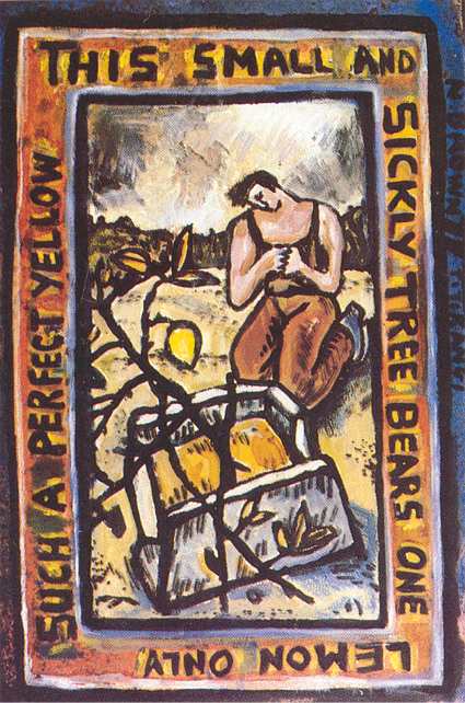 LEMON TREES: These works divide into two sets - small acrylics on paper and larger oils on board. All feature the figure of the symbolic black-singleted kiwi male, sometimes joined by members of his family, kneeling before a wizened, struggling backyard lemon tree. In a manner derived from Rouault all the works are bordered by loosely-painted frames and these frames contain brief phrases (samples: weeping weeping bitter by the lemon tree. . . Don't you see its green leaves sprouting?). In the final work in 1979 the tree has died after bearing one perfect yellow fruit, and the figure kneels bereft, helplessly questioning nature's will.