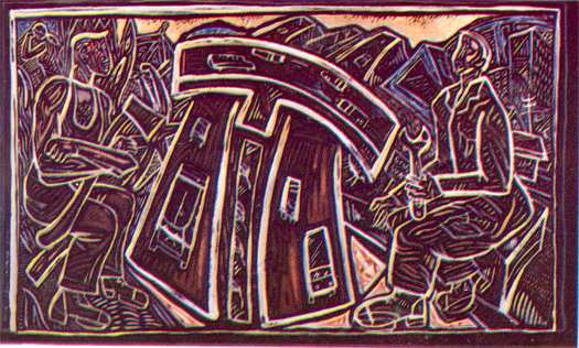 The artist will switch back and forth from one approach to the other. A good example is the recent Tour Protest series: which contains realistically treated oils painted in Thames and vigorously schematic lino- and woodcuts printed in Auckland, all done more or less at the same time.