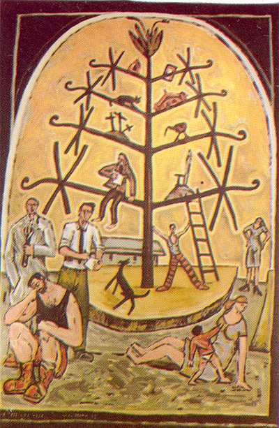 FERNS: Brown developed a simplified tree-fern image, something like an Egyptian ankh, and allowed it to proliferate into paintings which became quite diagramatic. This 'tree of life' symbol appears frequently later in the Ark, Cars, Trampers Adam & Eve and Poet series. (Losses I and 3.)