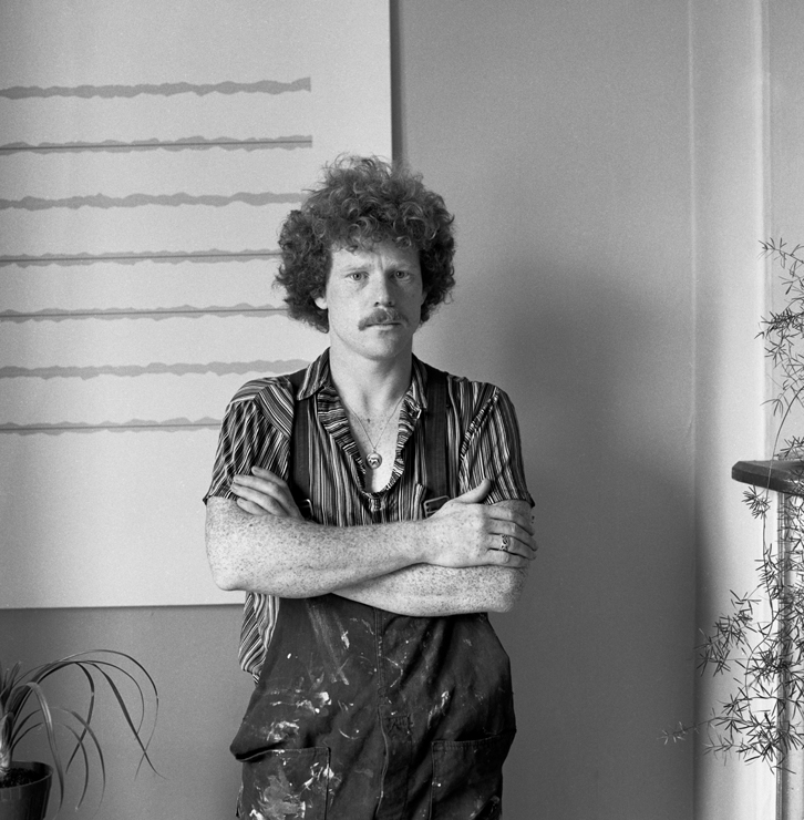 This contract is made clear in her portrait of Laurie Baker. He leans toward the camera, almost guarding his body with his arms. His expression shows a mixture of advance and defence: this is a photograph of a persona. Details of skin, hair, the texture of clothing, are keenly focused. The echoing curves of the composition heighten that sense of ambivalence: the aggression of his jutting shoulder is restrained by his left hand; the tight circles of his ear-ring and necklace are contrasted against the open, ragged edges of his shirt. An earlier photograph shows him relaxed, leaning against a brocade couch. Here the impression of sensuality is conveyed by textures of skin and cloth rather than by expression and pose. There is in both these portraits a theatricality which both photographer and subject are creating. Her portrait of the painter Shaun Burdon, taken immediately prior to the Surfaces series, is a tightly composed study. Graphic details echo the physical qualities of the subject: plants at lower right and left seem to follow the curves of Burdon's hair and head; and the corners of the recessed wall counter the lines of the painting. The musculature of his forearms is parallel with the lines in the painting; the paint stains of his jeans have a graphic similarity to the plant at the left. All these repetitions lead into the centre—Burdon's face, which looks out: warily and no wonder. The combination of subject, painting and Martyn's gentle but insistent details add up to the description of a real personality. The impression given is strengthened by the painting itself, in which the horizontal simplicity of the lines are softened, made a little uncertain, by the undulation of the paint.