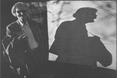The 1976 portrait of Rudi Gopas has the 'subject's' consent. He's standing by a crudely drawn text with his own initials next to it, and his own elegaic shadow across it. The amiable result contains a shadow portrait with an implicit story, references to Gopas's work, to his interest in cosmology. This wry photograph has the inclusiveness of a narrative succession of images.